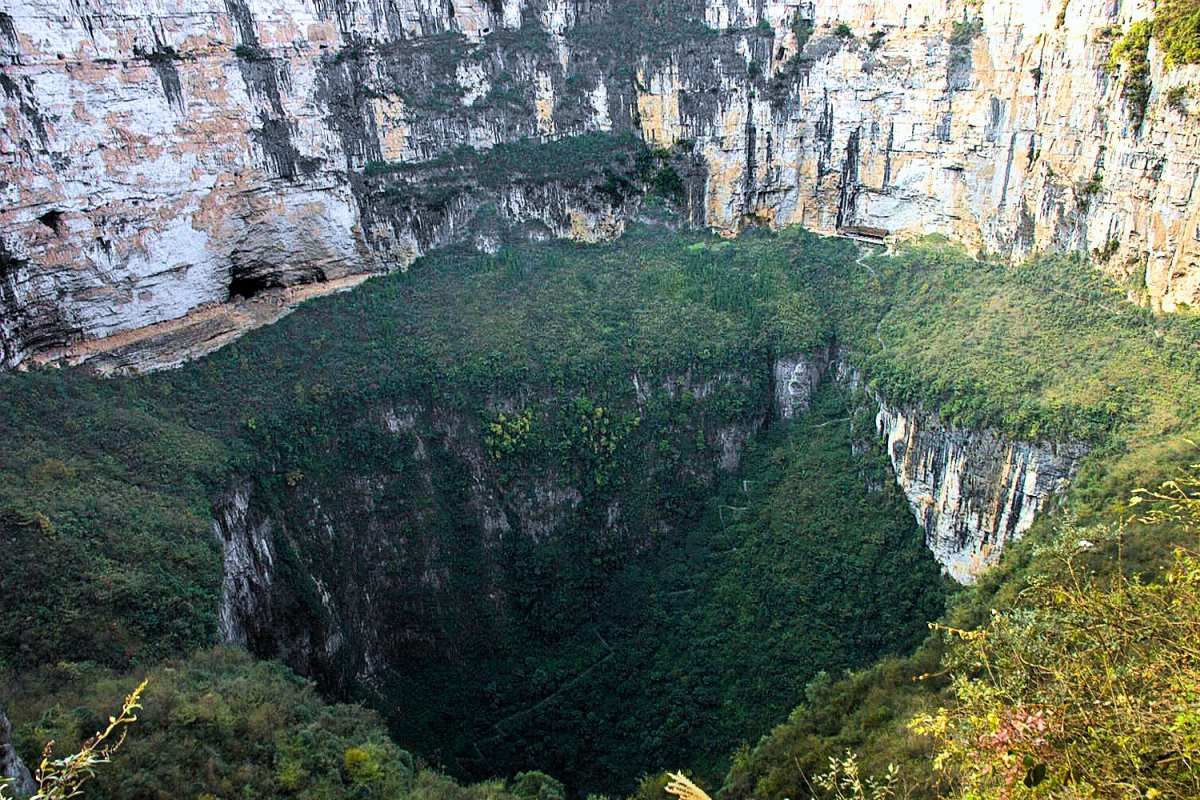 Nerealistická hloubka bez viditelného terénu dole – Tiankeng vždy má dno s vegetací.
